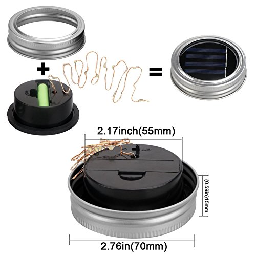 - Set of 3 Solar Mason Jar Lights: Pack of 3 silver lids with string lights (10 LEDs per string); Suit for most regular mouth mason jar (Mason jars & wire handles NOT included)