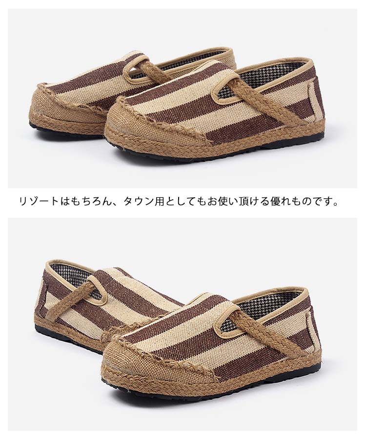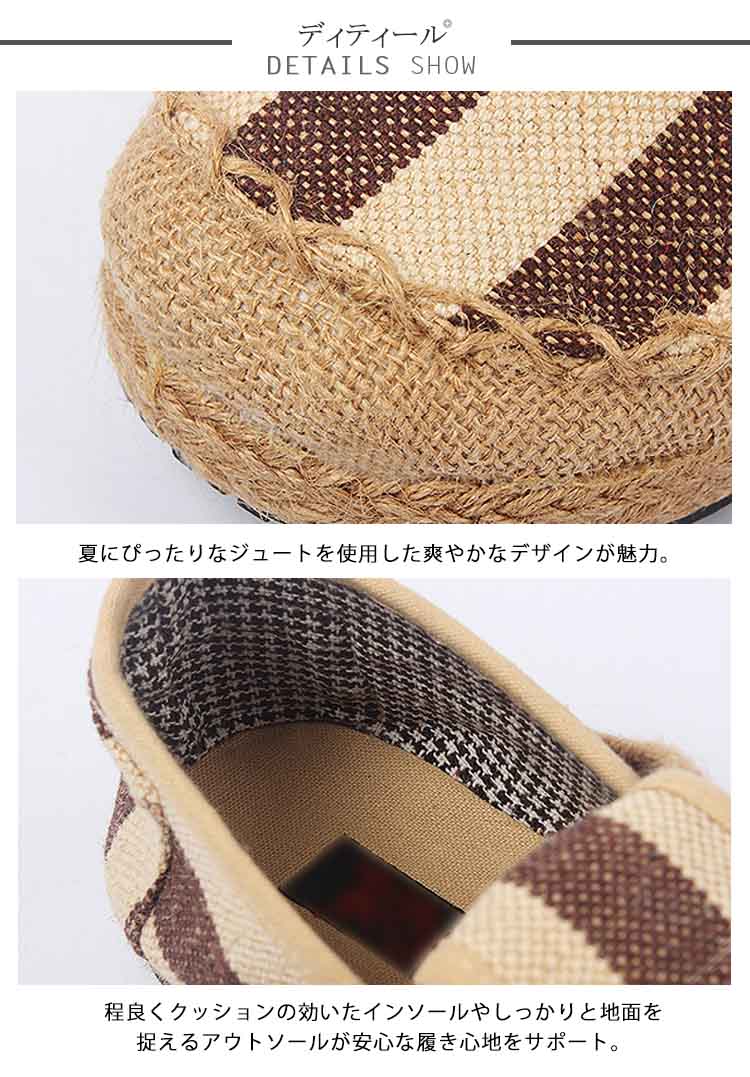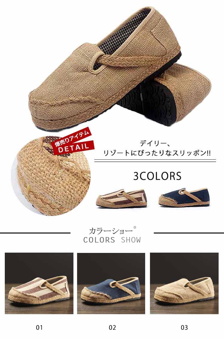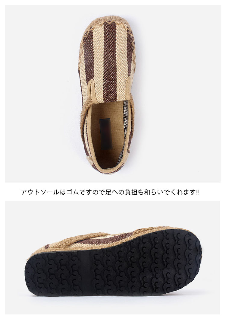 | デイリー、リゾートにぴったりなスリッポン!!涼しげなジュート素材とキャンバス生地のコンビ。アウトソールはゴムですので足への負担も和らいでくれます!!リゾートはもちろん、タウン用としてもお使い頂ける優れものです。 | |