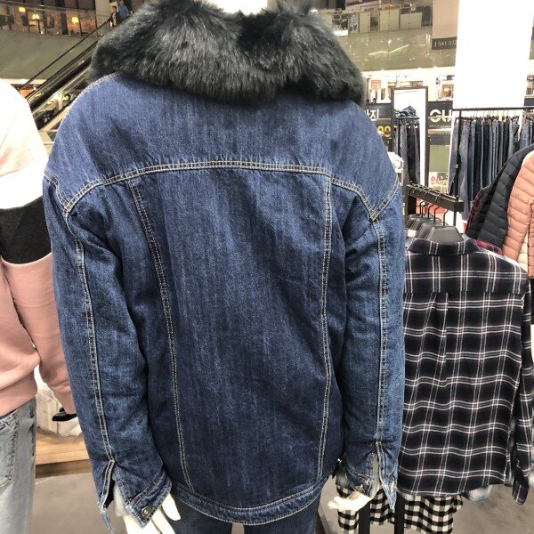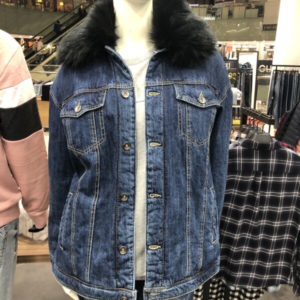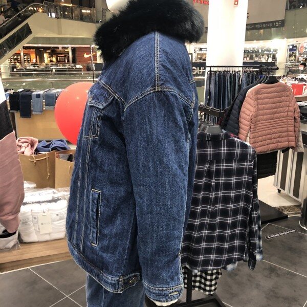 다크 인디고 톤 보다 약간 밝은 톤의 루즈핏 데님 트러커 몸판 안쪽 누빔처리되어 추운겨울에도 보온성과 착용감이 좋음 탈부착 되는 고급스러운 페이크 퍼 장식