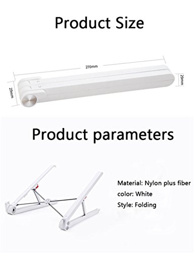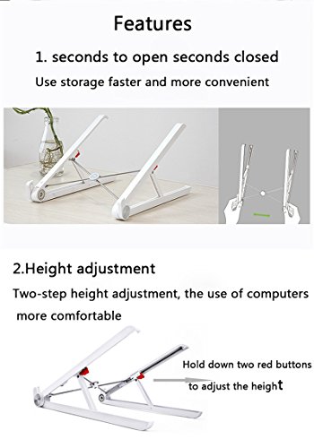 -. Feature : 1. Portable laptop stand, light and stable 2 business travel affordable, easy storage, business travel carry; / 3.Bracket adjustable gear 290 * 231 * 160mm Slope 30 ° / 290 * 241 * 146mm Slope 26 °; 4. Support laptop size: 11 inches -15.6 inches (flap support height: 25/13 mm); 5. Material: Nylon POM TPE stainless steel aluminum Ru Ru boron; / Features 1. seconds to open seconds closed Use storage faster and more convenient 2.Height adjustment Two-step height adjustment, the use of computers more comfortable Hold down two red buttons to adjust the height / 3. Folding design Foldable storage, easy to carry 4 piece change Depending on the thickness of the notebook to use different length of the file Support 11-15.6 inch notebook use