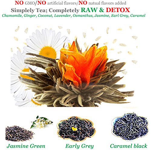 Designed by Jane London, Detox (MAGIC) flowering tea 12 counts is made of hand-plucked Silver needle WHITE tea with freshly dried ingredients. This collection has the unique MAGIC "snow falling effects" which truely create a fancy presentation. Each bloom is hand sewed together by artists with details to provide the best presentations. This pack comes with various flavors ONLY from the ingredients-Ginger, Coconut, Lavender, Chamomile and Osmathus. Each pack comes with 12 blooming teas. All natural ingredients, with no artificial and addictive's added. Silver needle white tea is rich in antioxidants, providing great health benefits. All ingredients are carefully selected for both quality and health benefits. Brew is easy. No tea bags are needed. Easy to carry around, such as travel, etc. No need use strainers when steeping, as each tea blossom is hand sewed together and all ingredients stay together. Add a new dimension to your tea drinking experience! Pleasure to watch tea blossoming and a great conversation starter. Ingredients: Silver needle white tea, Ginger, coconut flakes, osmanthus, lavender, chamomile, and lily. Great for hot or iced blooming tea, cocktails and Exotic blooming tea punches. After drink, it can be used as a home decor. Tea Beyond won the 2009 World Tea Champion and is a AKA stamp recipient (Ashley Koff Approved).The AKA stamp of approval is a trusted sign that the product, menu, recipe or gadget has been evaluated and approved by Celebrity Registered Dietitian Ashley Koff to be better quality and a healthier choice. Tea Beyond believes Better quality tea for Better Health. All tea Beyond products are made of materials from nature, such as glass, stainless steel, tea, herbs, et. No plastic parts. No GMO. No Artificial flavors or artificial addictive added. Our glass tea-wares are made of 20% recycled glass, better for the environment.Feature