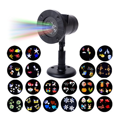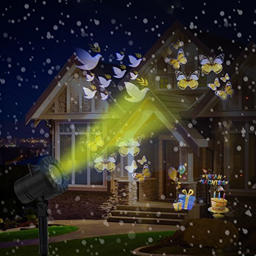 Colorful Multi-Pattern Light: This led projector light comes with 12 colorful slides (Santa, Snowflake, Stars, Birthday Cake, Maple Leaf, Clown, Halloween Ghost, Pigeons, Heart, High Heels, Butterfly and Clover),patterns move automatically when ppower on, users can change pattern by change slides freely.