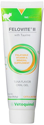-. Binding : Misc. -. Brand : Vetoquinol -. EAN : 0017030019223 -. Feature : Palatable vitamin/nutritional and mineral supplement / Taurine in a Tuna-flavored base cats can't resist / Supplement for cats and kittens, / Taurine in a Tuna-flavored base cats cant resist -. Label : Vétoquinol USA -. LegalDisclaimer : All sales are final! No returns, refunds or exchanges are allowed. -. Manufacturer : Vétoquinol USA -. Model : 412624 -. MPN : 412624 -. PackageQuantity : 1 -. PartNumber : 412624 -. ProductGroup : Pet Products -. ProductTypeName : PET_SUPPLIES -. Publisher : Vétoquinol USA -. SKU : 412624 -. Studio : Vétoquinol USA -. Title : Vetoquinol 412624 Felovite II,2.5 oz -. UPC : 017030019223