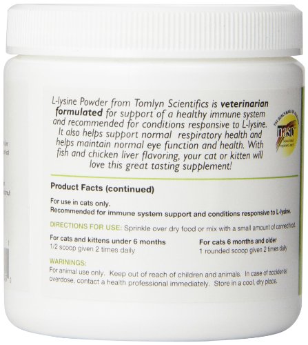 -. Binding : Misc. -. Brand : Tomlyn -. Color : White -. EAN : 0030521033430 -. Feature : Supplement for cat to help support normal respiratory function and maintain normal eye health / High levels of L-Lysine Hydrochloride - 500 mg / Veterinarian formulated / 100% Satisfaction Guaranteed! -. Label : Lambriar Vet -. Manufacturer : Lambriar Vet -. Model : 433343 -. MPN : 433343 -. NumberOfItems : 1 -. PackageQuantity : 1 -. PartNumber : 433343 -. ProductGroup : Pet Products -. ProductTypeName : PET_SUPPLIES -. Publisher : Lambriar Vet -. Size : 3.5 oz. -. Studio : Lambriar Vet -. Title : Tomlyn Immune Support L-Lysine Supplement Powder for Cats, 100g -. UPC : 787461623930