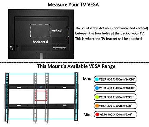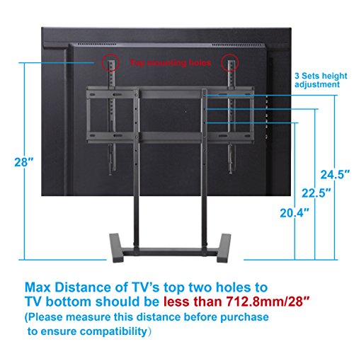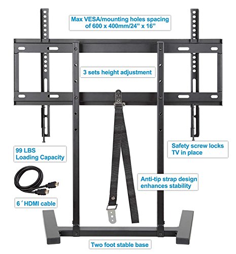 -. Feature : Fits for most of 42-60" LCD/LED/Plasma TVs. Fits TVs with VESA/mounting holes spacing from 100mm x100mm (4" x 4") to 600mm x 400mm (24" x 16"). Please check your TV's VESA (mounting hole pattern), and make sure the distance from top two mounting holes to TV bottom is less than 712mm/28" / Unique design! Anti-tip strap is available to ensure TV tight and safe in case children pull in front of TV. 29" strap with 88 LBS loading capacity can attach onto table or wall for your preference. / Two-foot-base provides a stable and safe support of TV. Heavy duty construction holds TV up to 99 LBS. / 3 sets height adjustment for perfect TV height to gain better viewing. Easy installation frees your TV from drilling holes onto wall, placing TV where you want. / All hardware included for both wall and TV installation. Constructed with heavy duty steel materials and with durable powder coated finish. Advanced welding Technology-Automatic Robot welding technology ensures stable, sturdy and safe use.