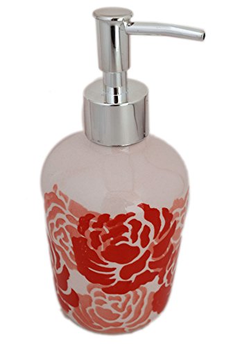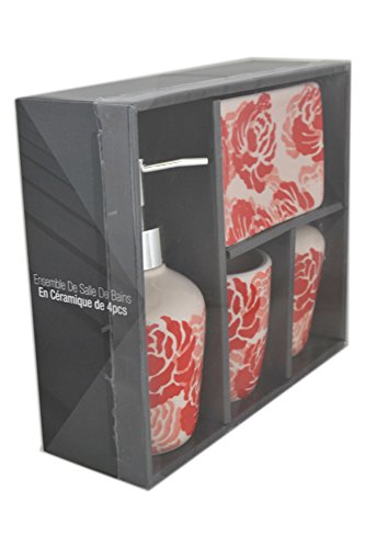 -. Feature : 4 Piece Bathroom Accessory Set in Gift Box / Includes: Soap Pump & Soap Dish & Toothbrush Holder & Tumbler / Durable Ceramic Construction / Coral Pink and Red Floral Pattern / Approximate Size: Pump: 6.75" x 3" x 3" - Tumbler: 3.6" x 3" x 3" - Toothbrush Holder: 4" x 3" x 3" - Soap Dish: 5.5" x 3.5" x 1.5"