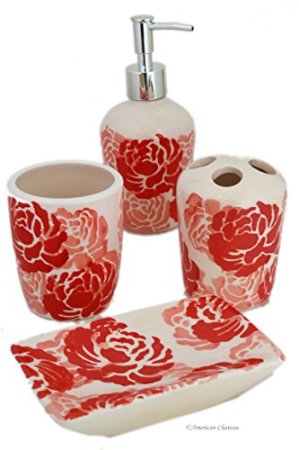 -. Title : Set 4 Piece Red/Coral/White Floral Ceramic Bathroom Accessories