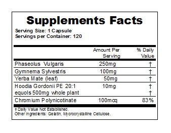 -. Feature : CARBO(5) Carbohydrates Blocker and Appetite Suppressants with Phaeolus Vulgaris (White Kidney Bean Extract), Gymnema Sylvestris, Hoodia Gordonni, Yerba Mate (leaf), Chromium Polynicotinate 120 Capsules
