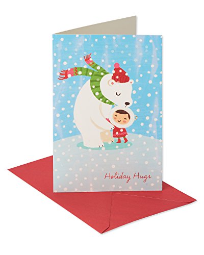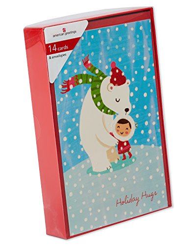 An adorable polar Bear and girl Hug in a snow-filled scene embellished with sparkling glitter - perfect for sending holiday hugs to everyone on your Christmas list! this Deluxe boxed set of 14 high-quality greeting cards and 14 Red envelopes is a great value when you want to make the card experience more special. Stock up and brighten their season!.Feature