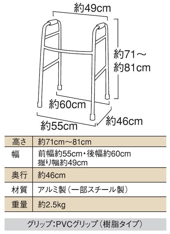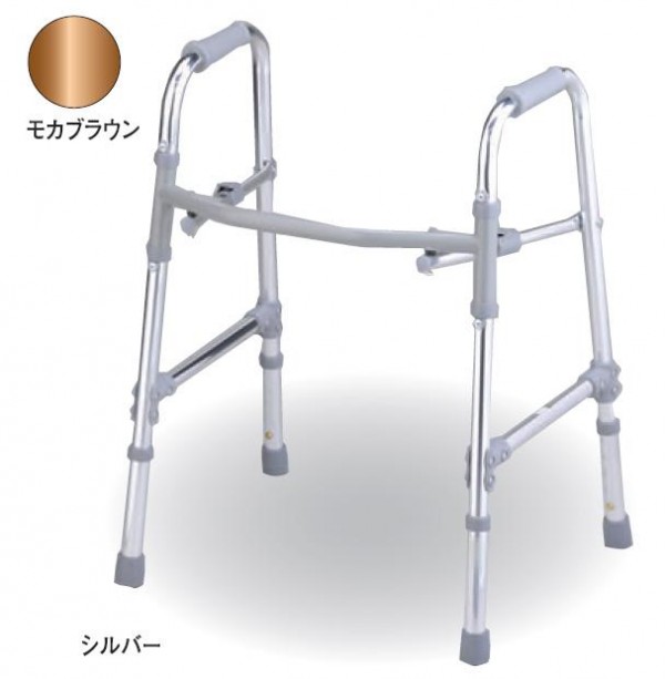 両手で歩行器を少しずつ前に進めていくタイプです。歩行器の開く角度が2段階に調節できトイレや車いすからの立ち上がりなどの補助としても使用できます。