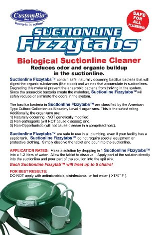 -. Binding : Health and Beauty -. Brand : CB -. EAN : 0798304098518 -. Feature : Reduces Odor And Organic Buildup In Suctionline / This Product Is Great For Any Business Using A Suction Line In There Office. / East To Use Natural And Safe / Non Hazardous / Non Corrosive / Safe For All Plumbing / Will Digest The Organic Substances (Like Blood) And Wastes That Accumulate In Suctionlines. / There Are 6 Fizzytabs In One Package. One Year Supply If Used Every 2 Months to Up Keep Your Lines. -. Label : CB -. Manufacturer : CB -. Model : CBSF -. MPN : CBSF6 -. PackageQuantity : 6 -. PartNumber : CBSF6 -. ProductGroup : Kitchen -. ProductTypeName : HEALTH_PERSONAL_CARE -. Publisher : CB -. Studio : CB -. Title : Suctionline Fizzytabs -. UPC : 798304098518