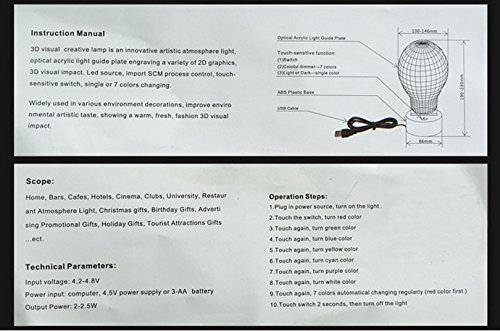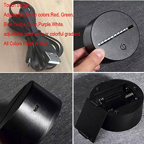 -. Feature : 7 Color change: Red, Green, Blue, Yellow, Cyan, Pink, White. / The 3D Illusion Light is powered long life, super bright LED lights, which never get hot and use very little energy, this is the perfect night light for children. / Touch button: Press one time, one color light up, press it again, it turns off. Press it thirdly, another color light up,so you can change different color modes. / Energy saving. Power spend: 0.012kw.h/24 hours; LED life span: 10000hours / It can be put in bedroom, child room, living room, bar, shop, cafe, restaurant etc as decorative light