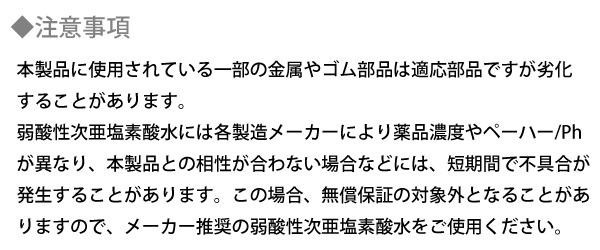 | 仕様 | 定格電圧:100V・50/60Hz 消費電力:30W 水タンク容量:約4.5L 加湿量(/h)/最大:約330ml・最小:約120ml 加湿目安/木造和室:6畳・洋室:10畳 コードの長さ:約1.5m(0.75mm2×2VCTFK) 弱酸性次亜塩素酸水適応(株式会社テクノマックスのハセッパー推奨) 電流ヒューズ2.5A付き(安全装置) 連続加湿時間/最小噴霧時「弱」:約45時間・最大噴霧時「強」:約13~13.5時間 |