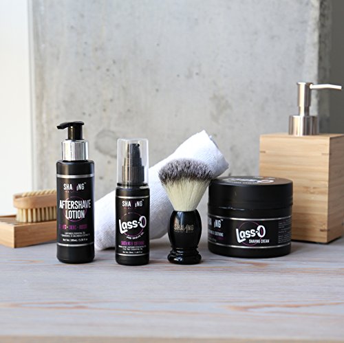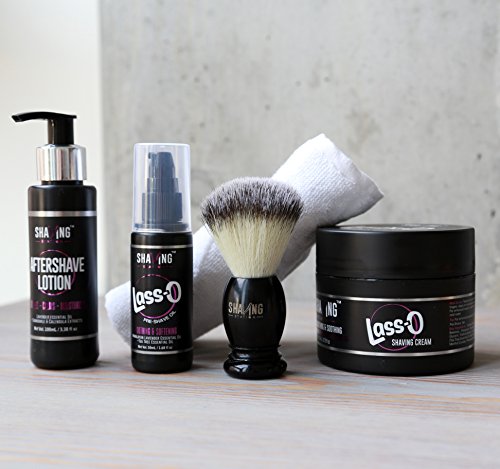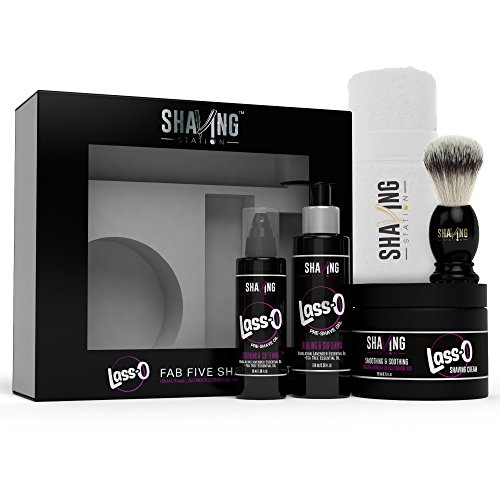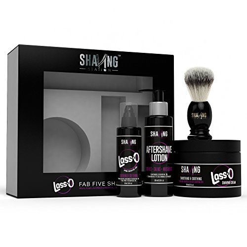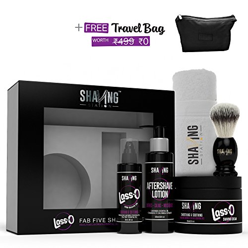 - This Starter Kit contains of the following products: This Kit contains of the following products: 1. Shaving Station's Lass-O Shaving Cream 2. Shaving Station's Lass-O Pre Shave Oil 3. Shaving Station's Aftershave Lotion 4. Shaving Brush 5. Face Towel
