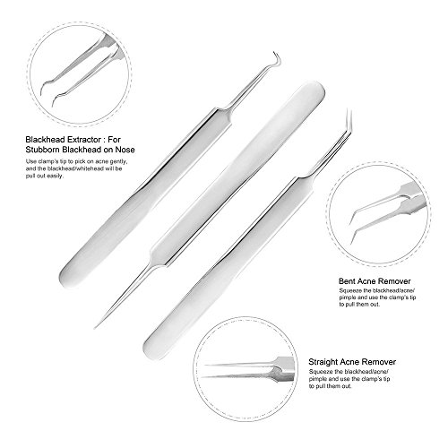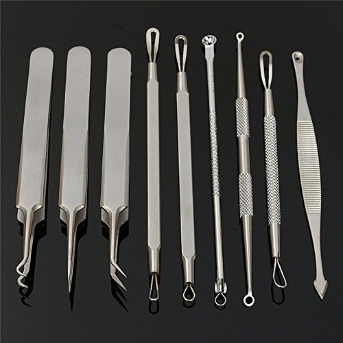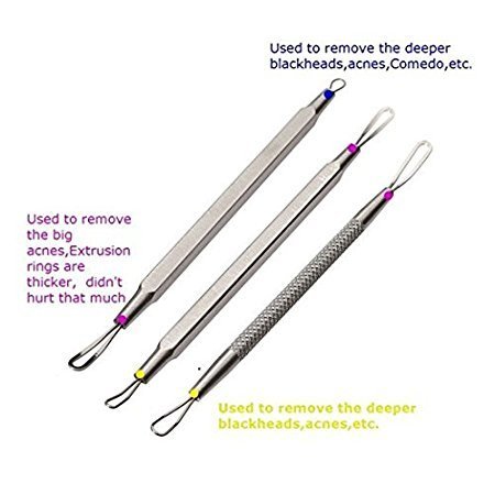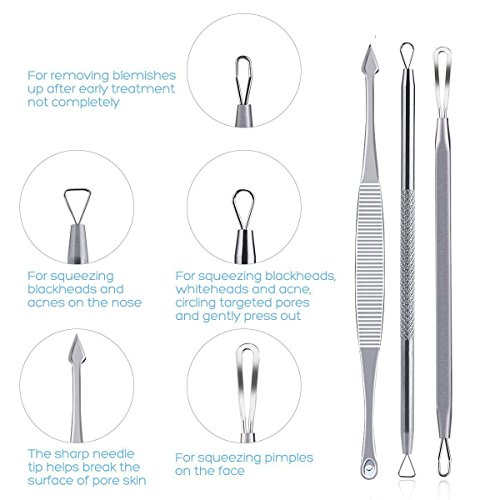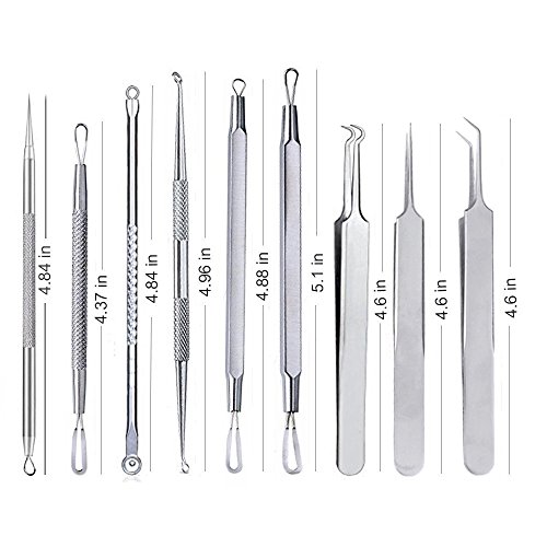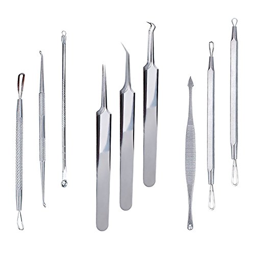 Blackhead comedone extractor : The blackhead remover kit includes 9 different high quality extractors which are made of stainless steel for rust-free, corrosion and stain resistance.