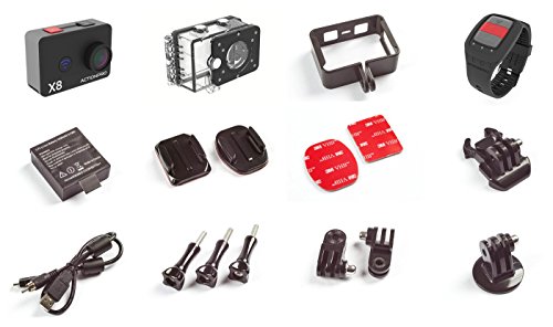 X8 Kamera;Wasserdichtes Gehause 50m;Armband-Funkfernbedienung;Skelettgehause;Lithium Ionen Akku;Gerade und gebogene Klebeplatten;Ersatz Klebeflachen;Tripod Adapter;Befestigungsfuss;Verbindungsstucke;Befestigungsschrauben;USB Kabel