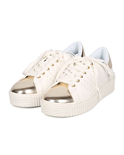 Product Description These super convenient sneakers are made with a leatherette upper, metallic capped toe and lace up front. Also made with a ridged platform outsole and self tie closure. 0