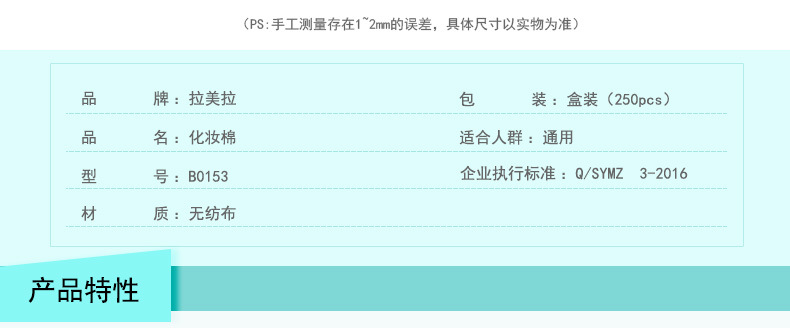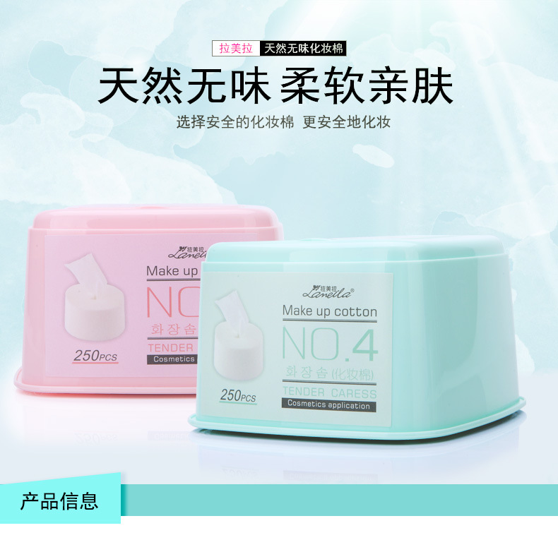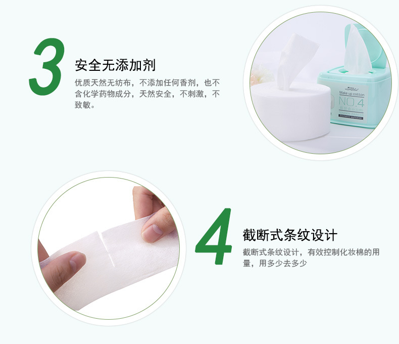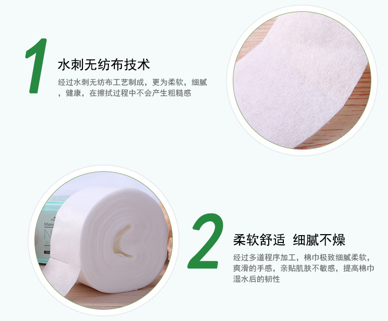 产品特点:由天然材料制成,质地柔软舒适、温和细腻;超实惠超薄设计,更省化妆水,超细密,高效释水;不残留棉絮,不起球。密度高有效帮助肌肤吸收护肤精品。