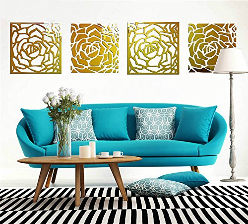 Romantic 4 Rose Flower Wall Art DIY Acrylic Mirror Crystal Wall Sticker TV Sofa Background Decorative 3D Mural Decals Living Room Bedroom Home Decor Decorations (Gold 30*120cm)
