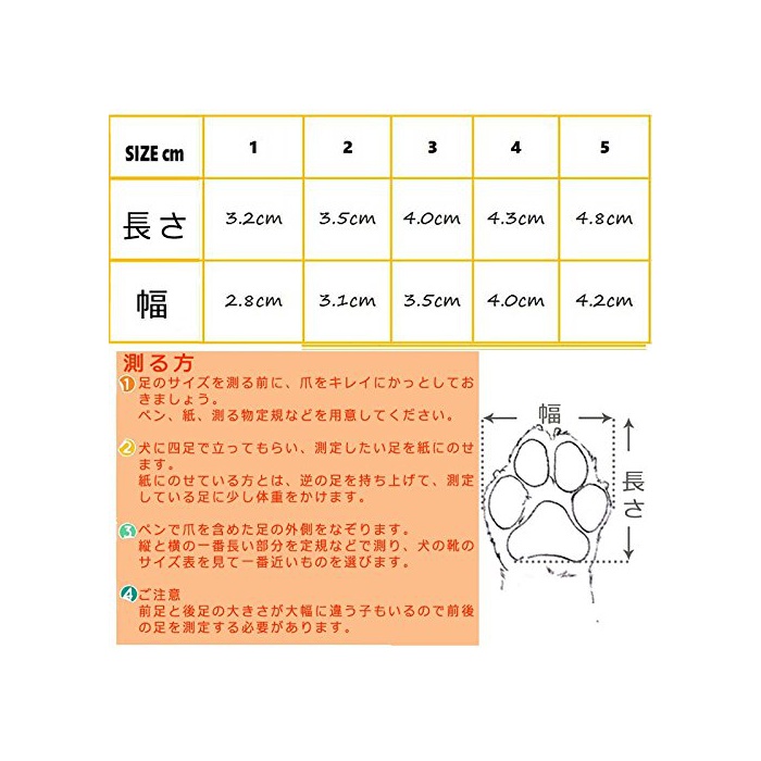 주의:개의 종류 로 인해 앞발과 뒷다리 미묘하게 크기가 다른 자식도 있으므로 때문에,구입하기 전에,반드시 전후의 발을 측정할 필요가 있습니다.사이즈표를 확인하신 후,애견의 발 보다 조금 약간 큰 사이즈를 입수해 주세요.