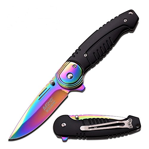 Mtech knives are among the fastest growing types of knives on the market right now for their cool, tactical designs for any covert operation. M-Tech 4.5in Rainbow Ti-Coated Blade has a 4.5in aluminum black handle with 1.2mm liner. The blade is a 3.2in rainbow ti-coated stainless steel blade and 3.5mm thickness. Spring assisted knife has black aluminum with rainbow ti-coated stainless steel bolster which includes a satin finished clip.Feature