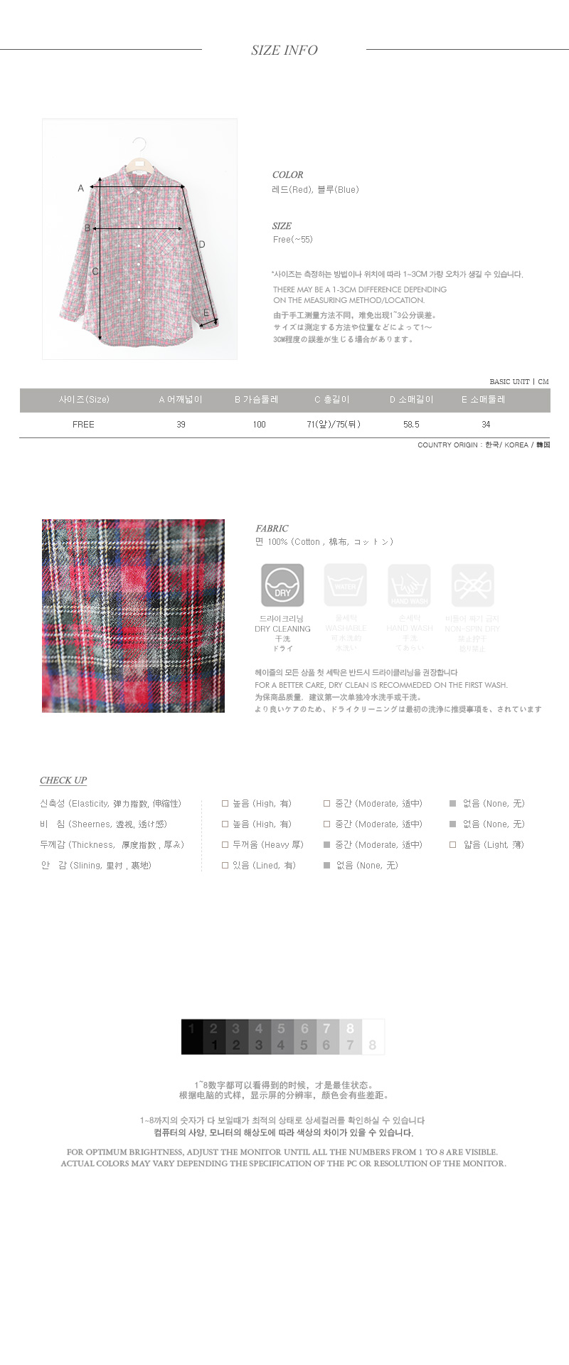 포인트로 매치하기 좋은 체크패턴의 베이직셔츠랍니다~ 가벼운 면소재감으로 시즌리스하게 입기좋은 체크셔츠구요 돋보이는 컬러감의 체크패턴이 다양한 룩에 포인트를 주는 아이템이에요! 겉면에는 화이트워싱이 이중으로 디자인되어 한층 더 매력적인 셔츠구요 베이직한 느낌으로 다양한 코디에 데일리하게 활용하기 좋은 아이템이에요~ 스커트,팬츠 등 어디에 매치해도 소화 가능한 기본 체크셔츠랍니다^^