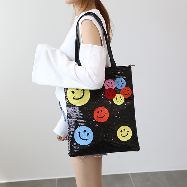 |  스팽글과 스마일 패치로 유니크한 매력의 에코백이에요! 가방 전면의 스팽글에 알록달록한 스마일 패치가 붙어있어 어떤 룩에나 포인트로 연출할 수 있답니다. 내추럴한 데일리룩에 하나만 들어줘도 정말 예뻐요! 넉넉한 크기로 다양한 소지품을 수납할 수 있어 편리하며 가방 후면과 내부에 지퍼포켓으로 중요한 물건을 깔끔하게 따로 보관할 수 있어서 더욱 실용성이 높은 아이템이에요 깔끔한 블랙 컬러가 준비되어 있어요 상세페이지 확인 후 굿 초이스 하세요!       | COLOR | 블랙 | | 제품 색상은 모니터에 따라 실제 색상과 차이가 있을 수 있습니다. | | | | FABRIC | 스팽글+합성피혁 | | | | PRODUCT ION | 제조국 / 중국 | | 품질보증기준 / 소비자분쟁 해결기준에 따름 | | A/S 책임자 및 고객센터 / 감성가방 | | | | SIZE INFO | 사이즈는 측정 방법에 따라 1~2cm의 차이가 있을 수 있습니다. | | 스트랩 길이는 연결 고리를 제외한 길이이며, 최대 길이입니다. | | (단위:cm, g) | | 가로 길이 | 세로 길이 | 너비 | 손잡이 높이 | 스트랩 길이 | 무게 | | 32 | 39 | 1 | 26 | - | 340 |  |