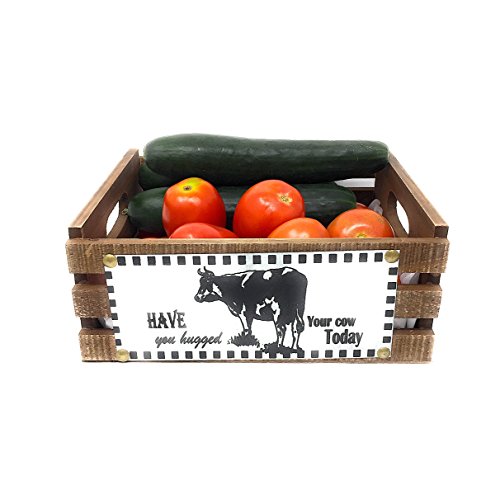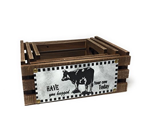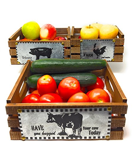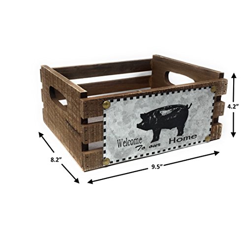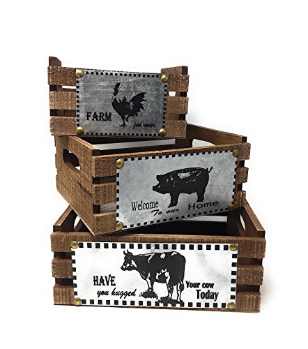 Farmhouse, country house inspired rustic decor nesting rectangle bins with metal galvanized plagues with images of cow, pig, and rooster.