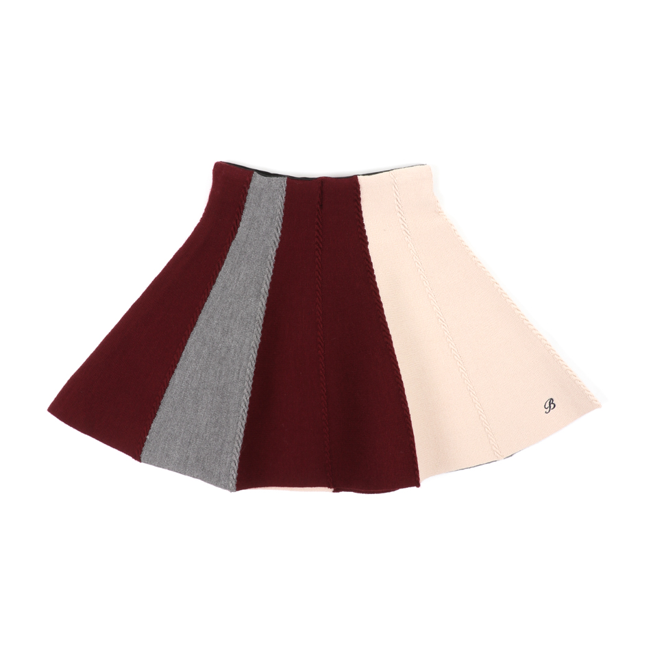 전체적으로 스판사가 섞여있는 플레어 스커트로 편안하면서 발랄하고 여성스러워 보이는 스커트입니다. 얇은 꽈배기 조직이 더욱 세련되어 보이도록 해줍니다. 다양한 컬러 블록킹이 다양한 색감을 보여주어 여러가지 코디가 가능하게 도와줍니다. 특히, 네이비 스웻셔츠와 깔끔하게 코디 가능하고 블라우스와는 세련되게 코디할 수 있습니다.