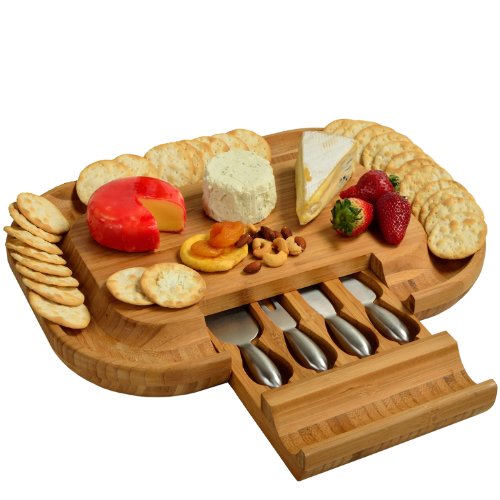 Deluxe Malvern Bamboo Cheese Set has an extra large serving area for cheeses and a high capacity curved cracker well around the entire board. The hidden drawer safely stores the included all stainless steel cheese tools (1) Fork (1) Spreader (2) Knives. The design of this distinctive entertaining set is based on our original Malvern Cheese board set with all the elegance of the original design plus added serving surface area. The drawer is removable for cleaning. Designed in the USA by Picnic at Ascot. Lifetime Warranty.Feature
