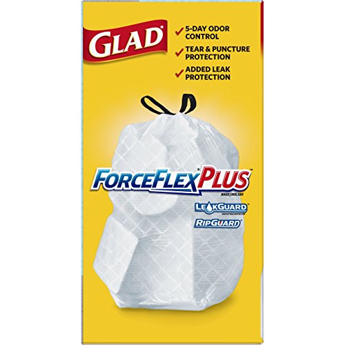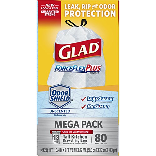 ReleaseDate : 2017-10-21 Studio : Glad Publisher : Glad Binding : Grocery Product Description Glad ForceFlexPlus Tall Kitchen Trash Bags are the perfect 13 gallon, strong and durable trash bag ideal for kitchen or seasonal cleaning. Glad offers Leak Guard, Rip Guard, Force Flex and Odor Shield technology providing a trash bag that protects against any kitchen disasters. The 3 ply drawstring securely grips to the trash can, keeping the garbage bag in place until removal. The outer layer of the white garbage bag is defended with Leak Guard for added leak protection, while the inner layer prevents rips and tears with the stretchable strength of Glad's Force Flex technology. While in use, the unscented trash bags, use Odor Shield technology to neutralize the strongest odors for up to 5 days. When it's time to take the trash out, Glad kitchen trash bags can withstand even the toughest and messiest garbage with Rip Guard protection. Just a quick cinch of the reinforced and durable drawstring makes for a simple removal and easy carrying. 0