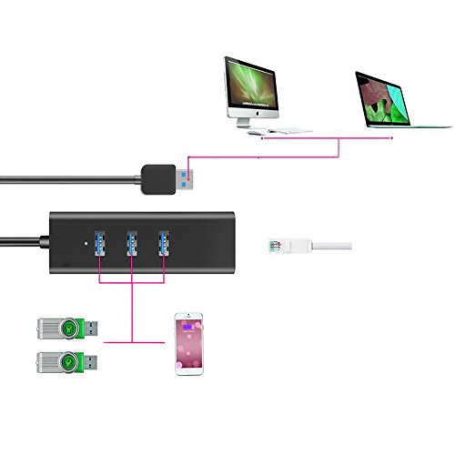 -. Feature : nstantly add 3 x USB 3.0 SuperSpeed ports and 1 x RJ45 gigabit ethernet port to your Ultrabooks, notebooks and tablets, perfect ideal for travel and use as external extension solution / 4-port USB 3.0 SuperSpeed ports provide high data transfer speed up to 5Gbp/s, backwards compatible with USB 2.0/1.1 devices / Built-in Gigabit Ethernet port gives access to super fast 1000Mbps network speeds, also backwards compatible with 10/100 Ethernet / Work and fun is fully integrated for your MacBook Air, MacBook Pro, iMac, Google ChromeBook, Microsoft Surface Pro, Lenovo Yoga, ThinkPad, Samsung, Dell ect with USB port interface / Built-in surge protection keeps your devices and data safe. Supports IPv4/IPv6 protocols, dual channel transfer mode, automatic transfer and data stream reversing regulation