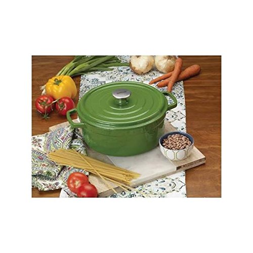 -. Feature : Large capacity 5-quart size is perfect for soups and stews / Attractive green enamel finish inside and outside adds style to the table / Double handles for easy lifting / Lid helps to lock heat in / Heats evenly for thorough cooking