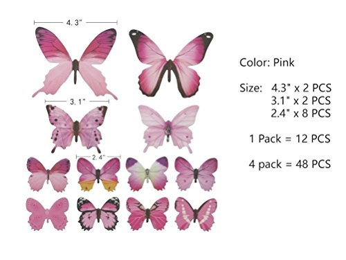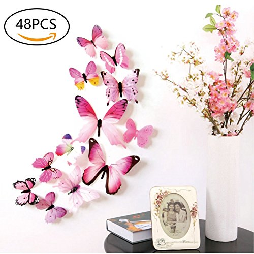 48 PCS Removable 3D Butterfly Wall Stickers Decals DIY Wall art Decor Home Wall Decoration Sticker Mural for Kids Girls Children Bedroom Living Room Background Nursery (Pink)