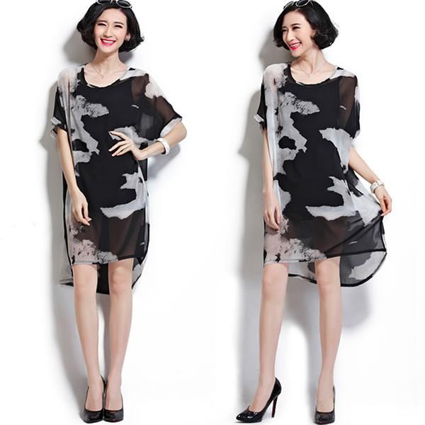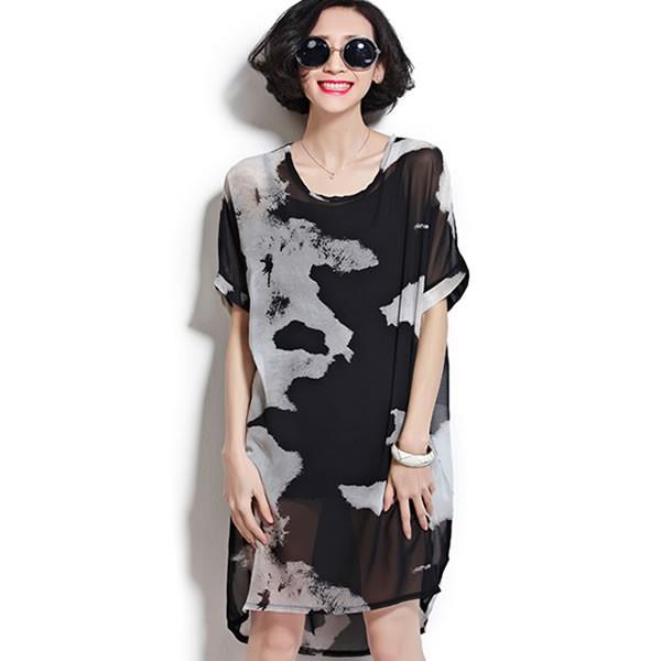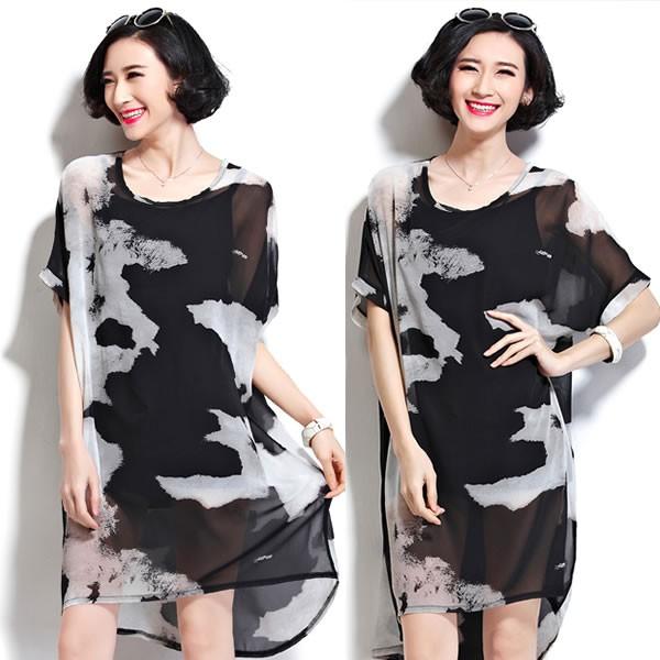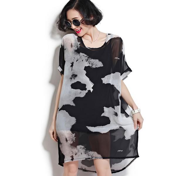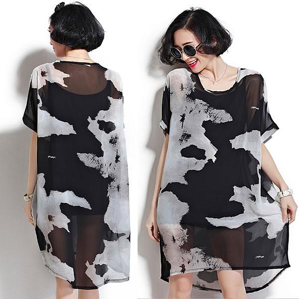 | 水墨風 透け シフォン チュニック ワンピース ミニ丈 黒 ブラック ワイドカットソー 【ワンピース レディース 女性 黒ブラックblack ロンデルブラック ドルマンスリーブ ワイド 体型カバー ワンピース 総柄 one-piece ワンピース】 | |
