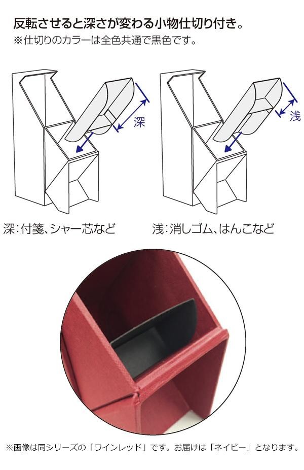 使わないときに中身が見えないすっきりとしたペンスタンドです。展開すると40度にキープされて取り出し易くなっています。 |