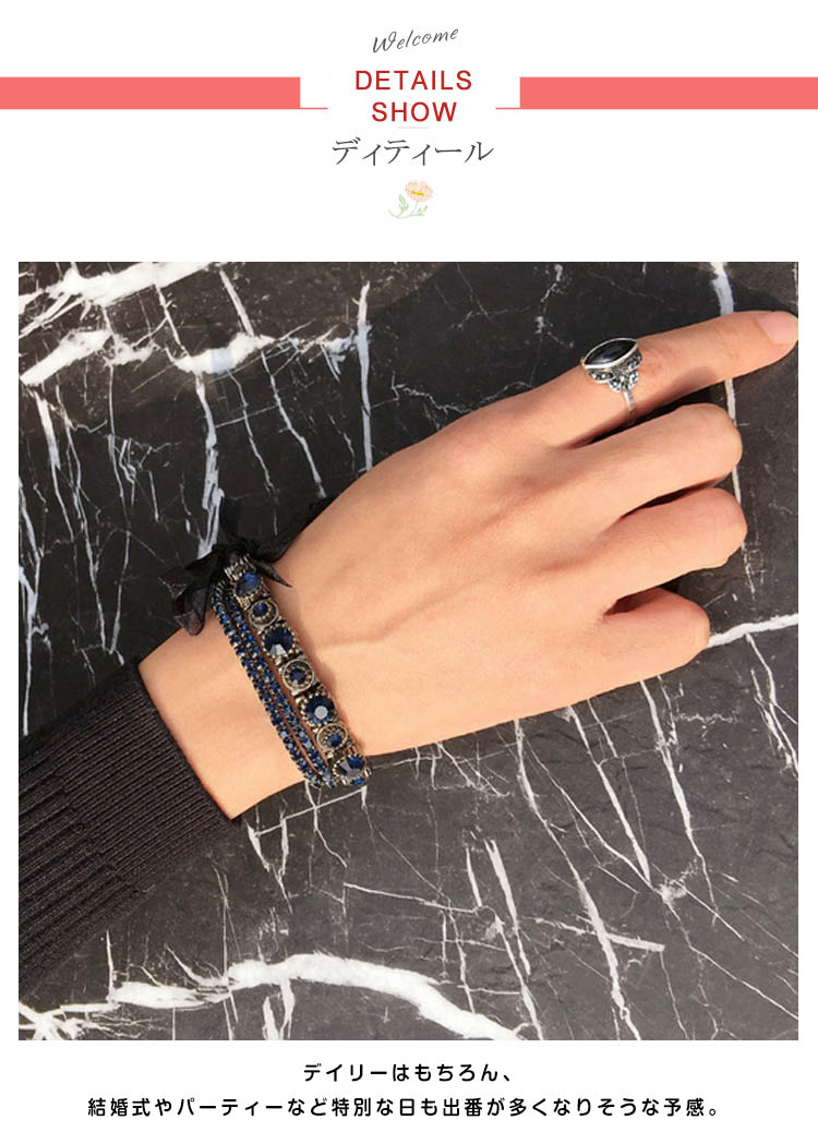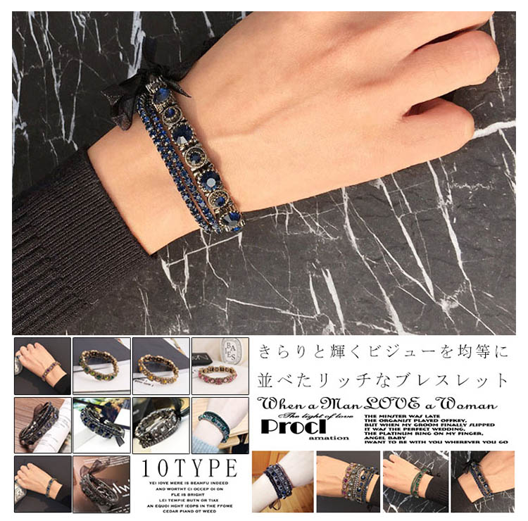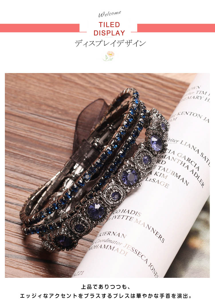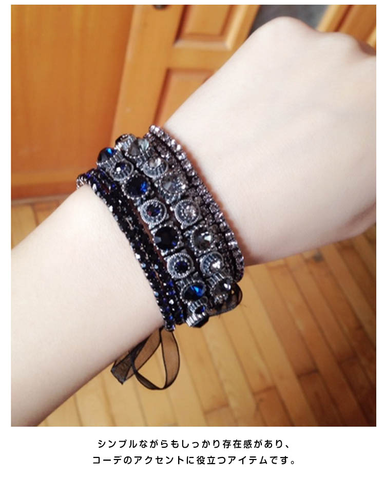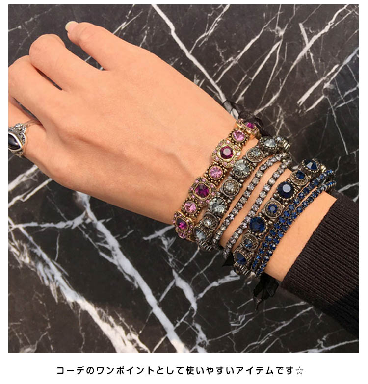 | きらりと輝くビジューを均等に並べたリッチなブレスレット。シンプルながらもしっかり存在感があり、コーデのアクセントに役立つアイテムです。上品でありつつも、エッジィなアクセントをプラスするブレスは華やかな手首を演出。 | |