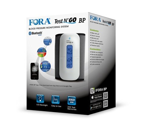 -. Brand : FORA -. Feature : Bluetooth connectivity, Stores 200 of the most recent readings / Power Saving: Automatic power off if system is idle for 3 minutes / LCD Backlight / Oscilloscope measuring method (automatic inflation ) / iFORA BP: Download free from Apple Store and Google Play Store -. IsAdultProduct : 0 -. Label : ForaCare -. Manufacturer : ForaCare -. MPN : 800-3140100-004 -. PackageQuantity : 1 -. PartNumber : 800-3140100-004 -. ProductGroup : Health and Beauty -. ProductTypeName : PERSONAL_CARE_APPLIANCE -. Publisher : ForaCare -. Studio : ForaCare -. Title : FORA Test N'GO Wireless Bluetooth (Arm) Blood Pressure Monitor for iOS and Android