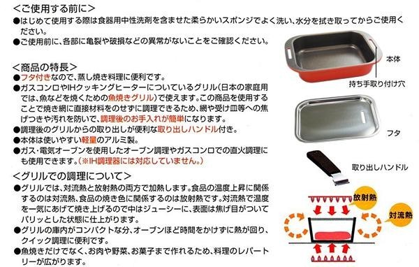 作りやすくて美味しい36レシピが載ったレシピブック付き。内側はくっつきにくいダイヤモンドコーティングでお手入れも簡単。本体は軽量アルミ製で少量料理に適したミニサイズです。調理後のグリルからの取り出しが便利な取り出しハンドル付き。 |