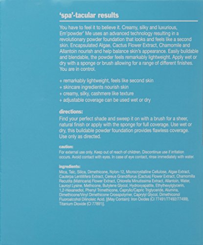 From our spa to your skin you’ve put your trust in us to care for your skin with our legendary spa services and world famous skin care products. Now we’re excited to introduce the next step to achieving complexion perfection. We like to call it tinted skincare. We’ve poured our innovative spa ingredients and advanced technologies into our tinted skincare products, so you’ll know they’re good for you and your skin. Spatacular results: you have to feel it to believe it. Creamy, silky, and luxurious, empowder me uses an advanced technology resulting in a revolutionary powder foundation that looks and feels like a second skin. Encapsulated algae, cactus flower extract, chamomile and allantoin nourish and help balance skin’s appearance. Easily buildable and blendable, the powder feels remarkably lightweight. Apply wet or dry with a sponge or brush allowing for a range of different finishes. You are in control.Feature