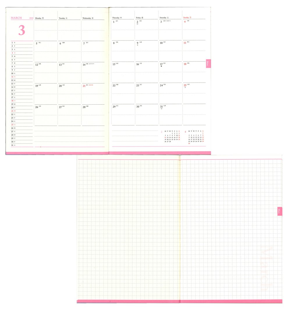 The monthly calendar page of the slim and easy-to-use monthly notebook that you can carry with ease, enriched the memo page in addition to the monthly calendar page.