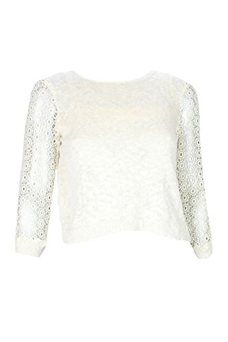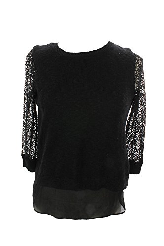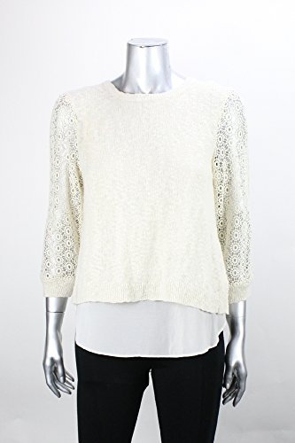 Mixed-media sweater with crochet three-quarter sleeves, slub-knit body, and woven living