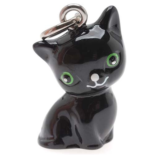 Hand painted resin charm depicting an adorable black cat with green eyes. Great for earrings, charm bracelets, cell phone charms and other themed projects. Approximate measurements : Charm is 21mm tall (including loop), 11mm wide. 2mm inner measurement of attached loop. 6mm open jump ring included. Quantity: 1 Charm.Feature