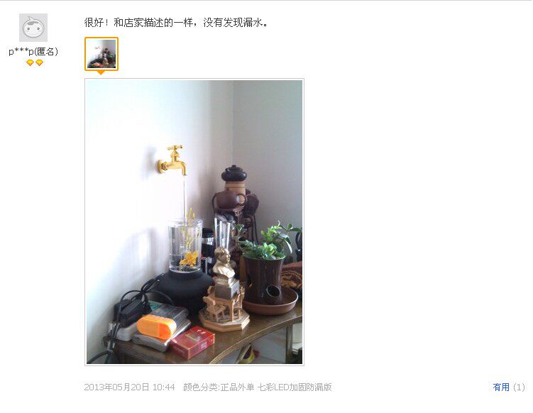 亲们,本款七彩LED流水灯是按照外国客户订制的要求下生产出来的,针对国内LED流水灯底部线路焊接粘胶不稳造成漏水大量退回的情况,生产出的加固防漏版本,因为是外单,故包装彩盒上面是英文的,插上电就可以的了,可以作为家居摆设也可以在里面养鱼作为创意鱼缸使用哦。作为礼物送给朋友也是相当有意思的,朋友肯定会被这么神奇的魔术水龙头深感兴趣的。