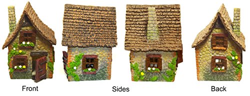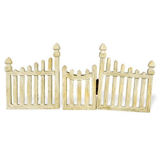 - Fairy cottage is 5" x 4.25" x 7", door opens with a metal hinge; white picket fence pieces are both are 2.25" Long x 2.75" Tall and one has a 1.25" Long gate that swings on a metal hinge
