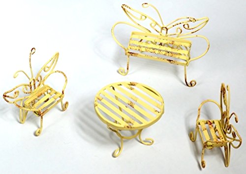 - Distressed pale yellow metal Butterfly furniture set with 2 chairs, bench and table; chairs are 3.25" wide x 2.75" Tall, Bench is 4.25" Long x 3.75" Tall, Table is 2.75" Diameter x 2.25" Tall