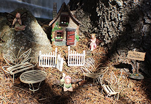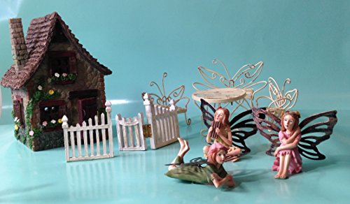 - Cottage, 3 fairies, fence and gate, Fairy party sign, 2 chairs, bench and table; sign and fairies on 1.25" metal picks to insert in soil, sand, foam, Rocks, etc., pick not Included in Measurements