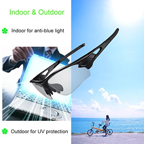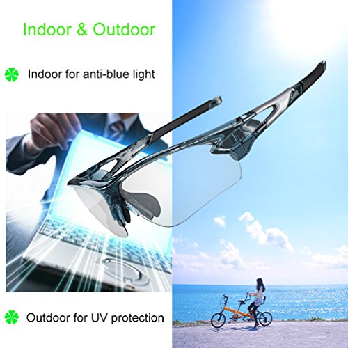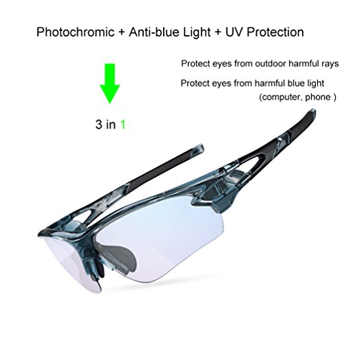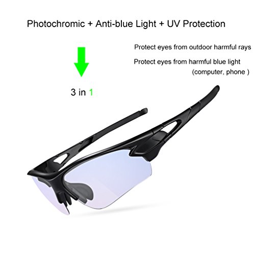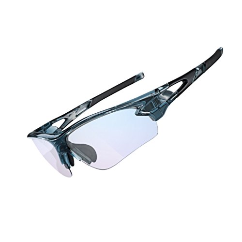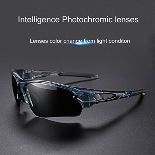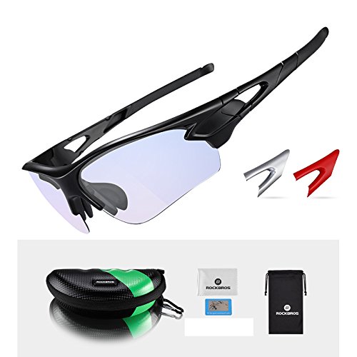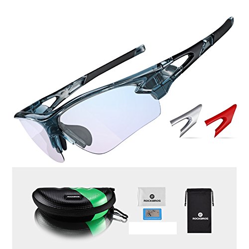 Product Description Product Details: Brand:RcokBros Weight: 30g/pair Gender: Unisex Adult, Youth Color: Black,Gray Transmittance: 80%-18% (80% is light gray color when in low UV, 18% is dark gray color when in high UV) Frame material: TR 90 Delicate lenses :Lenses with UV Protection Anti-blue Light Intelligence photochromic technology Product Dimensions: Lens height: 1.65 inches Nose bridge: 0.78 inches Frame length:5.51 inches Package Included : 1* Intelligence Photochromic anti-blue Light lenses 2* pairs of frame accessories 1* Portable pouch 1* Glasses box 1* Glasses cloth Warning: Color changing time differs from intensity of sunlight.Winter for about 3 minutes , summer for about 2 minutes Features: SMART AND CONVENIENCE:3 in 1 Intelligence lenses changing from light to dark based on the UV intensity.Lighter the outside,darker the lenses.Do not need to change lenses for different light conditions ADJUSTABLE AND CUSTOMIZED:A flexible fit on narrow or wide faces benefit from high toughness rubber adjusting temples.Furthermore ,soft rubber nose bridge can adjusting to your expected angle maximum personalized outfit.Cozy temples and nose bridge softer for all day long wearing than plastic DURABLE AND LIGHTWEIGHT:only 30 grams,PC made lenses and frame process durable RockBros photochromic lenses goggles.Lightweight lighter pressures from the glasses CLARITY VISION AND EYE PROTECTION:Transparent lenses in the normal light condition and change from different light conditions to ensure your clarity vision Notice: When wearing photochromic transparent lenses of glasses through the dark tunnel,suggest to slow down to ensure your safety