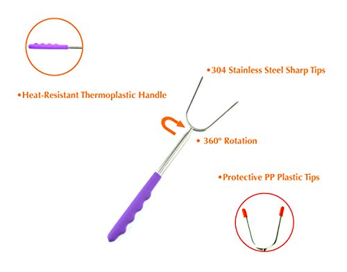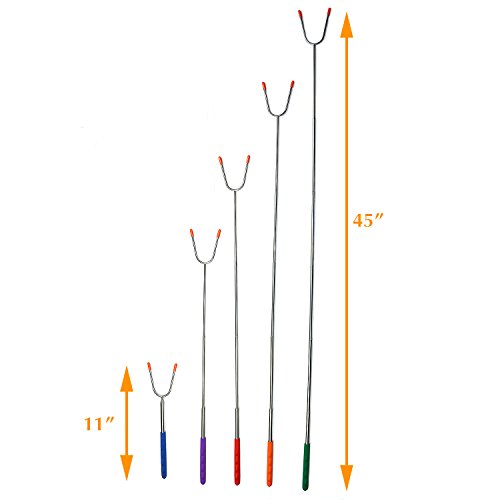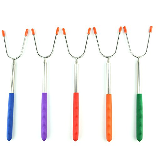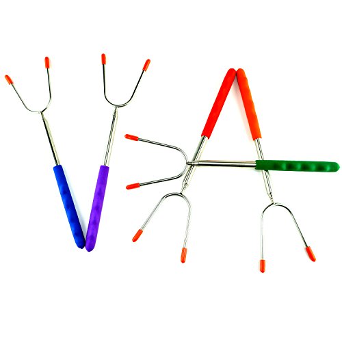 - 🔥EXTRA LONG FORKS WITH 5 DIFFERENT MULTI COLORED HANDLES - The extra long design will keep you and your loved ones at a safe distance away from any campfire, patio fire pit, barbecue grill, bonfire or bbq. The multi colored, heat resistant handles make identification easy using bright, strong colors: Red, Green, Blue, Orange and Purple. The days of kids fighting over "which marshmallow sticks belongs to who?" are over - each will have his very own stick to roast with!