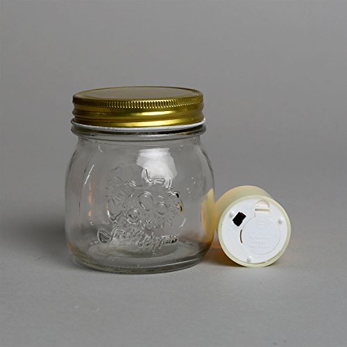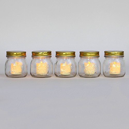Description: Set of 5 Glass Mason jars with 5 flameless votives. Each flameless votive includes 1 Warm White LED. The LEDs glow softly inside each plastic candle mimicking the effects of a real candle.